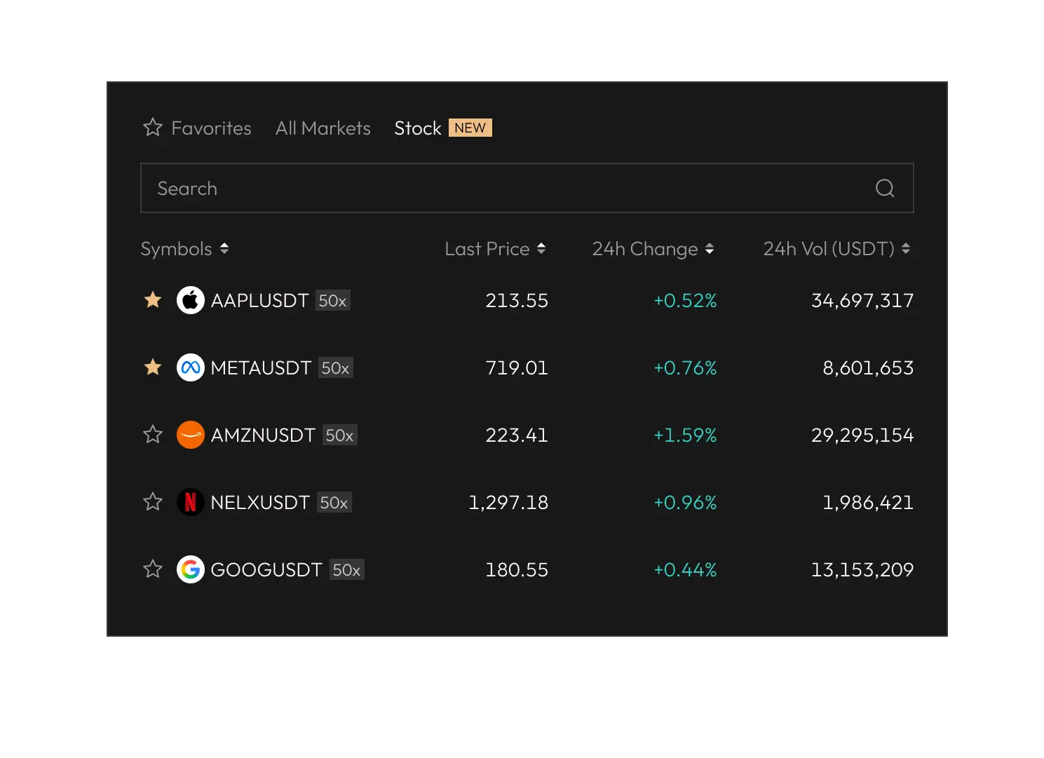 Trade U.S. stock with up to 100x leverage. Fully settled in crypto, no bridging required.